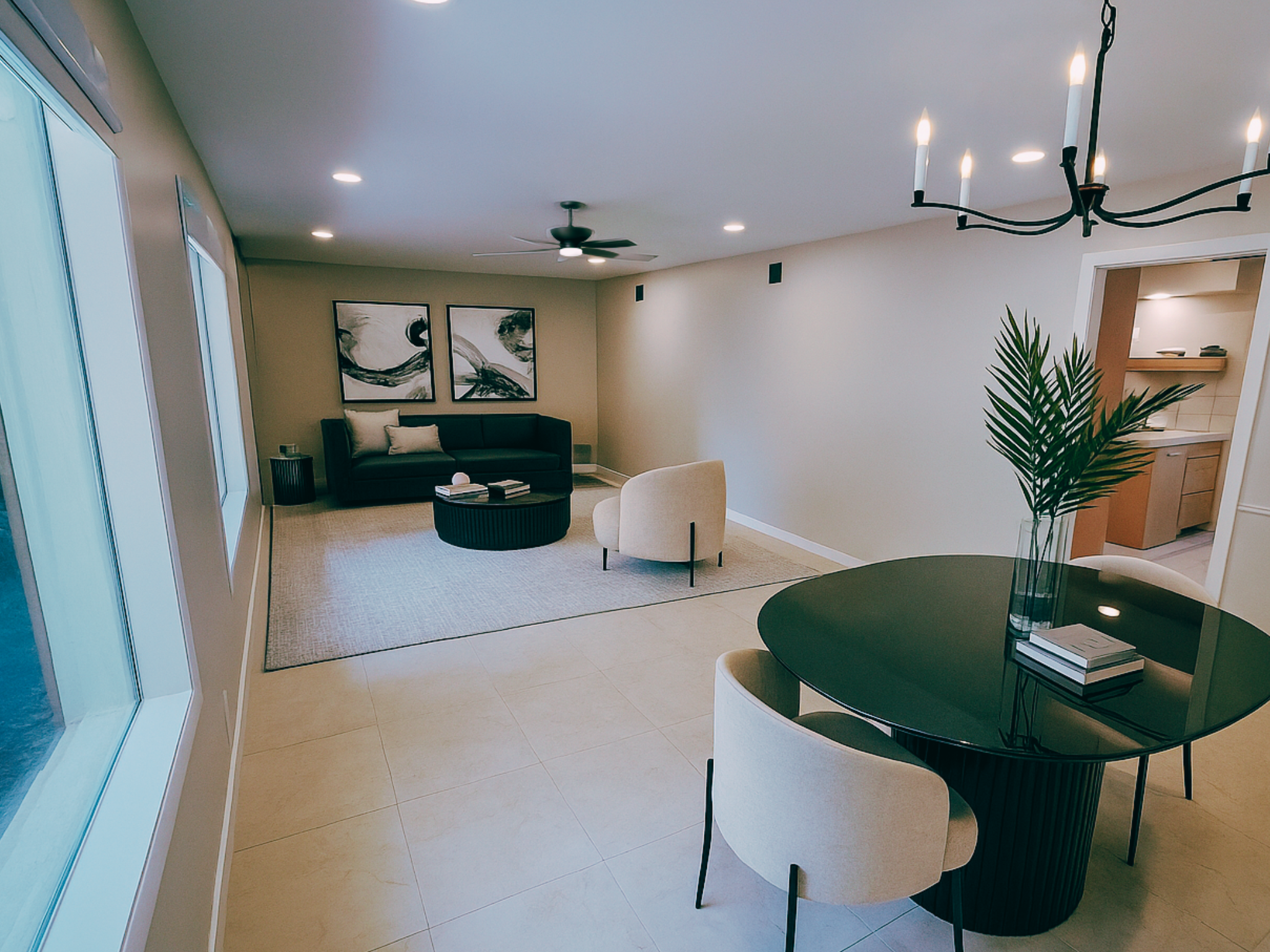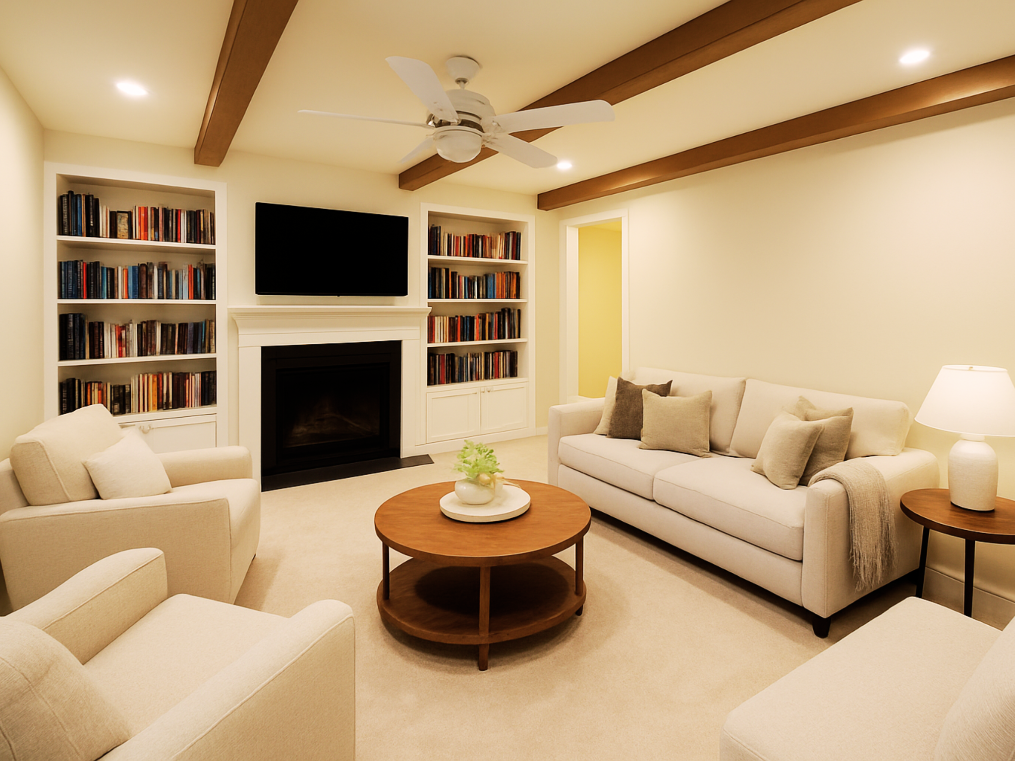 The living room remodel transforms the heart of the home into an inviting yet streamlined space. Neutral tones and sleek, modern furniture create a warm, welcoming atmosphere perfect for relaxing or entertaining.