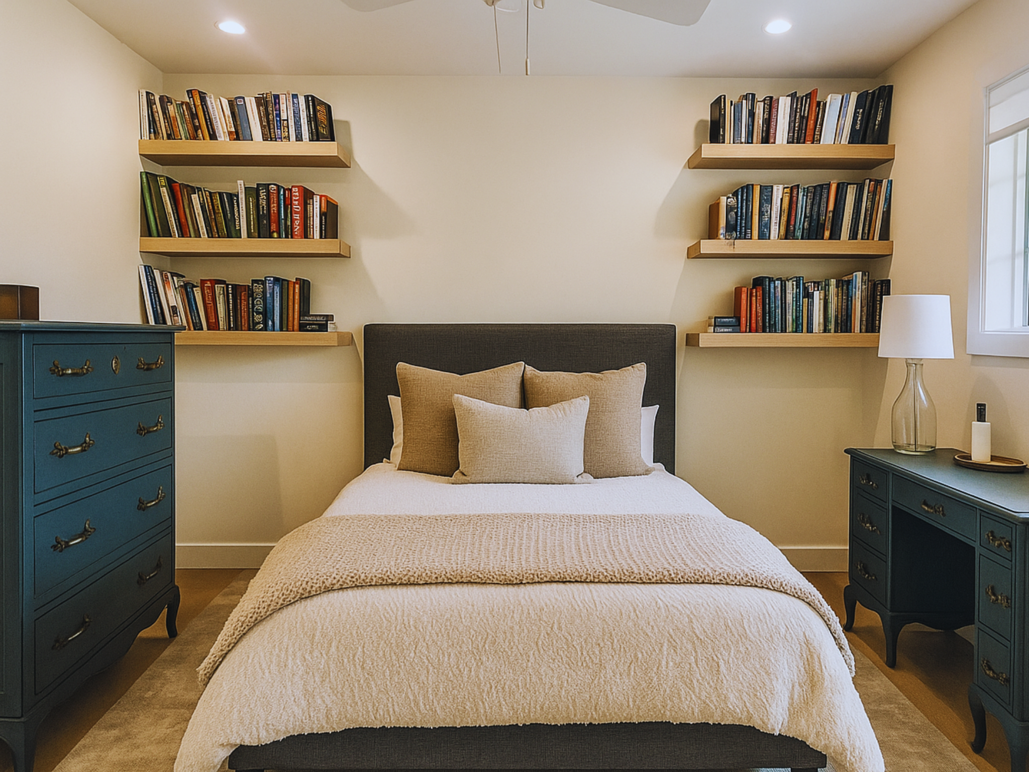 The bedroom remodel focuses on comfort, tranquility, and modern elegance. Built-in shelving provides seamless storage, while layered textures and soft, neutral tones create a restful retreat. The design stays true to the home’s minimalist aesthetic while adding subtle warmth.